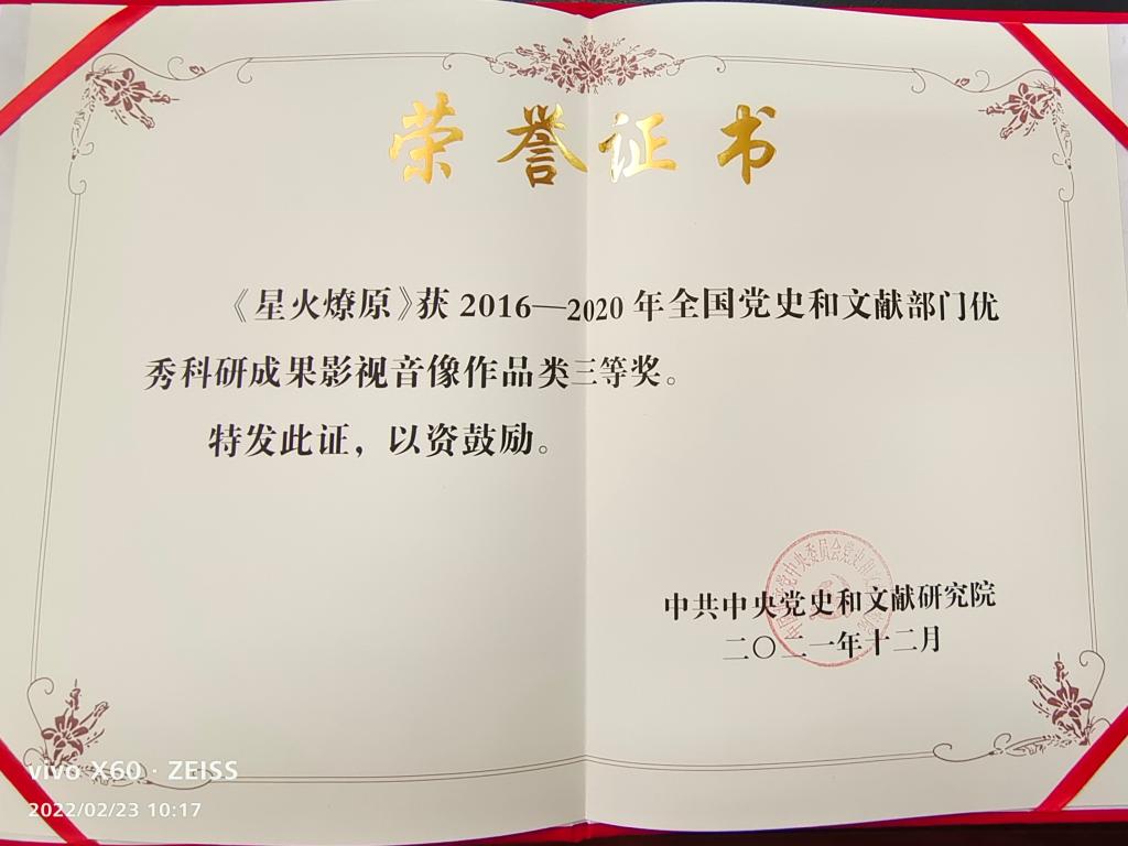 近日,全国党史和文献部门主要负责人会议以视频形式召开,会议表彰了2016—2020年全国党史和文献部门先进集体、先进个人和优秀科研成果。由中共宝鸡市委党史研究室联合宝鸡市教育局共同制作,由beat365官网马克思主义学院院长刘晓勇和麟游县委常委、县纪委书记、县监委主任上官青云担任编剧的五集地方党史影片《星火燎原》荣获“2016—2020年全国党史和文献部门优秀科研成果影视音像作品类三等奖”。这是近年来宝鸡党史研究成果获得的最高奖项。