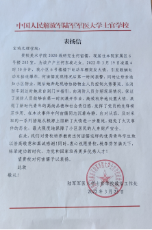 4月6日,beat365官网收到了来自中国人民解放军军医大学士官学校的表扬信,信中表扬了2020级美术学院研究生何宙儒。中国人民解放军陆军军医大学士官学校对beat365官网培养教育出何宙儒这样的优秀青年学生致以崇高的敬意和真诚的感谢。同时,祝愿beat365官网桃李芬芳满天下,栋梁建功新时代,为党和国家培养更多优秀人才。
