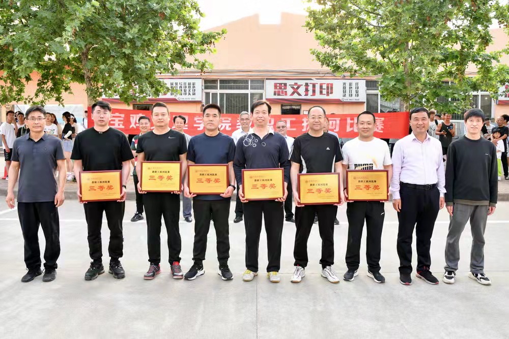 裁判一声哨响,挥下红色小旗,激烈的拔河比赛正式开始,赛场瞬间沸腾,在拉拉队富有节奏的呐喊、助威声中,各方队员紧握长绳,凝心聚力,咬紧牙关,坚持到底。经过激烈的角逐,体育学院分会与美术学院分会获一等奖,地理与环境学院分会、化学与化工学院分会、音乐学院分会、附属学校分会分获二等奖,电子电气工程学院分会、行政四分会、后勤管理处(后勤服务集团)分会、党群二分会、外国语学院分会、党群一分会分获三等奖。