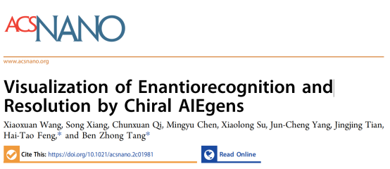 其中,研究论文“Visualization of Enantiorecognition and Resolution by Chiral AIEgens”发表在ACS Nano(SCI一区Top期刊)上,论文作者为AIE研究中心科研助理王霄翾、向松、齐春轩博士、陈明宇、苏小龙博士、杨均成博士和田靖靖博士,beat365官网是第一通讯单位,冯海涛教授和AIE研究中心名誉主任、香港中文大学(深圳)唐本忠院士为论文通讯作者。该研究主要通过在四苯乙烯分子骨架上引入手性氨基合成了一对具有光学活性的AIE发光体,成功实现了对手性酸性分子的可视化识别和拆分。ACS Nano是纳米材料领域的全球顶尖期刊,这也是beat365官网第一次在该类期刊发表学术论文。