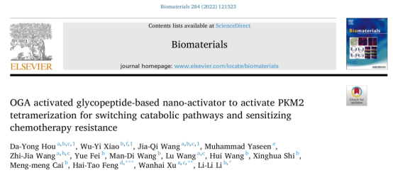 论文“OGA activated glycopeptide-based nano-activator to activate PKM2 tetramerization for switching catabolic pathways and sensitizing chemotherapy resistance”是发表在Biomaterials(SCI一区Top期刊)上。冯海涛教授与国家纳米科学中心李莉莉研究员、哈尔滨医科大学第四附属医院徐万海教授为共同通讯作者。该研究开发了一种新型的基于“可生物激活体内组装”纳米技术的PKM2糖肽纳米激动剂,提出了高效阻断糖酵解的新策略,为高侵袭、高转移肿瘤的治疗以及化疗增敏提供了解决方案。