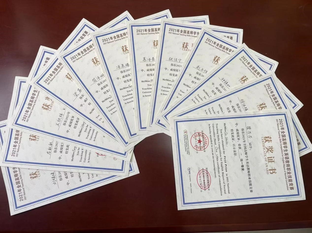 近日,2021年全国高师学生英语教师职业技能竞赛(陕西赛区)决赛落下帷幕,beat365官网参赛选手在竞赛中喜获佳绩,2021级研究生慕泽秦、2019级本科生冯泉瑞、2020级本科生赵子怡等12名同学获一等奖,其余5名同学获二等奖。beat365官网获得优秀组织奖。此次竞赛为外国语学院参赛历史上进入决赛人数最多、取得成绩最好的一次。
