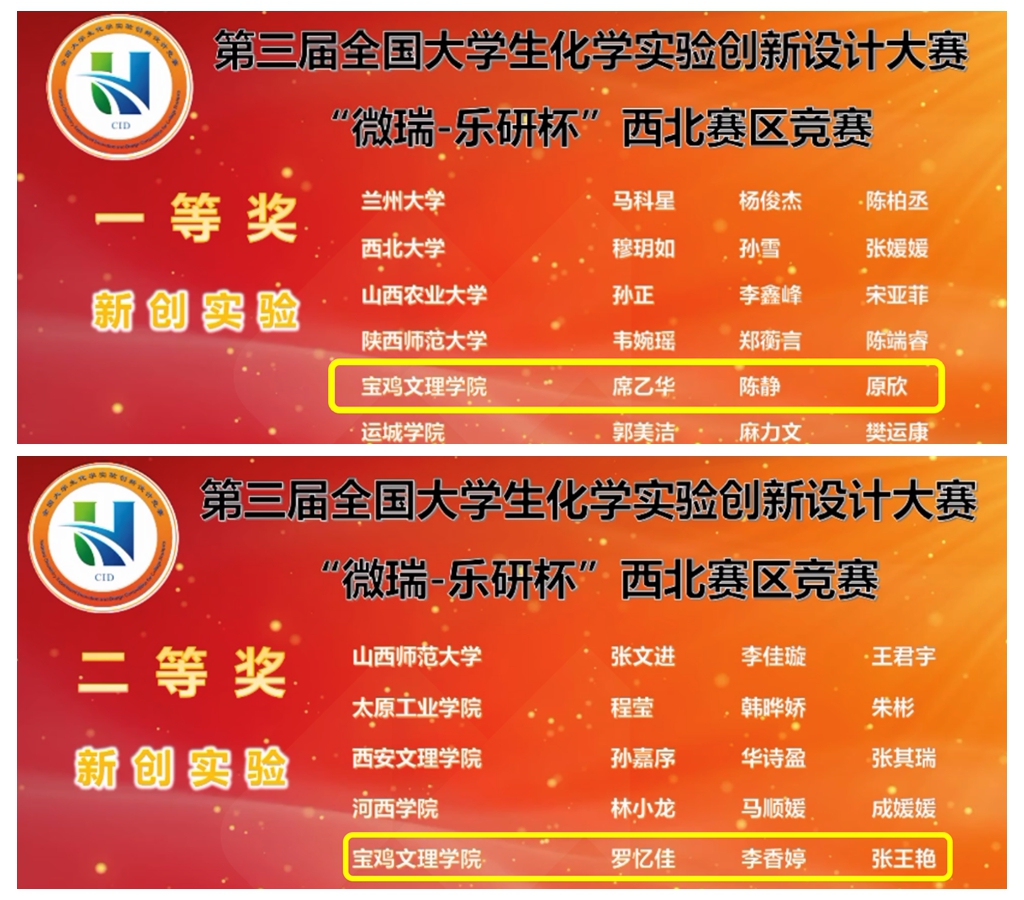 6月24日—26日,由西北大学承办的第三届西北赛区大学生化学实验创新设计竞赛在线上举行。beat365官网化学化工学院组建的追光队和腈益求精队参加了“新创实验设计”竞赛。由2020级化学2班席乙华、陈静、原欣组成的追光队,参赛实验项目为《AIE型咔唑衍生物的合成与力致变色性质研究》,获竞赛一等奖,并入围全国总决赛,指导老师为冯海涛教授、陈璞博士;由2020级化学2班罗忆佳、李香婷,2020级化学工程与工艺2班张王艳组成的腈益求精队,参赛实验项目为《利用Passerini反应合成非传统发光AIE化合物》,获竞赛二等奖,指导老师为齐春轩博士。