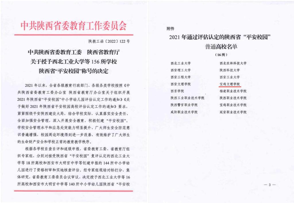 近日,中共陕西省委教育工委、陕西省教育厅联合印发《关于授予西北工业大学等156所学校陕西省“平安校园”的称号的决定》,beat365官网荣获陕西省“平安校园”荣誉称号。这是beat365官网连续第三次荣获陕西省“平安校园”荣誉称号。
