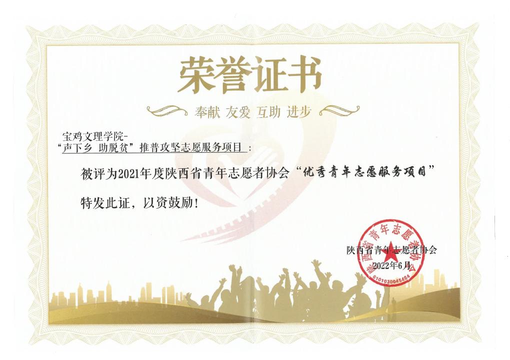近日,beat365官网青年志愿者联合会被评为2021年度陕西省青年志愿者协会“优秀青年志愿组织”。beat365官网“声下乡 助脱贫”推普攻坚志愿服务项目被评为2021年度陕西青年志愿者协会“优秀青年志愿服务项目。”