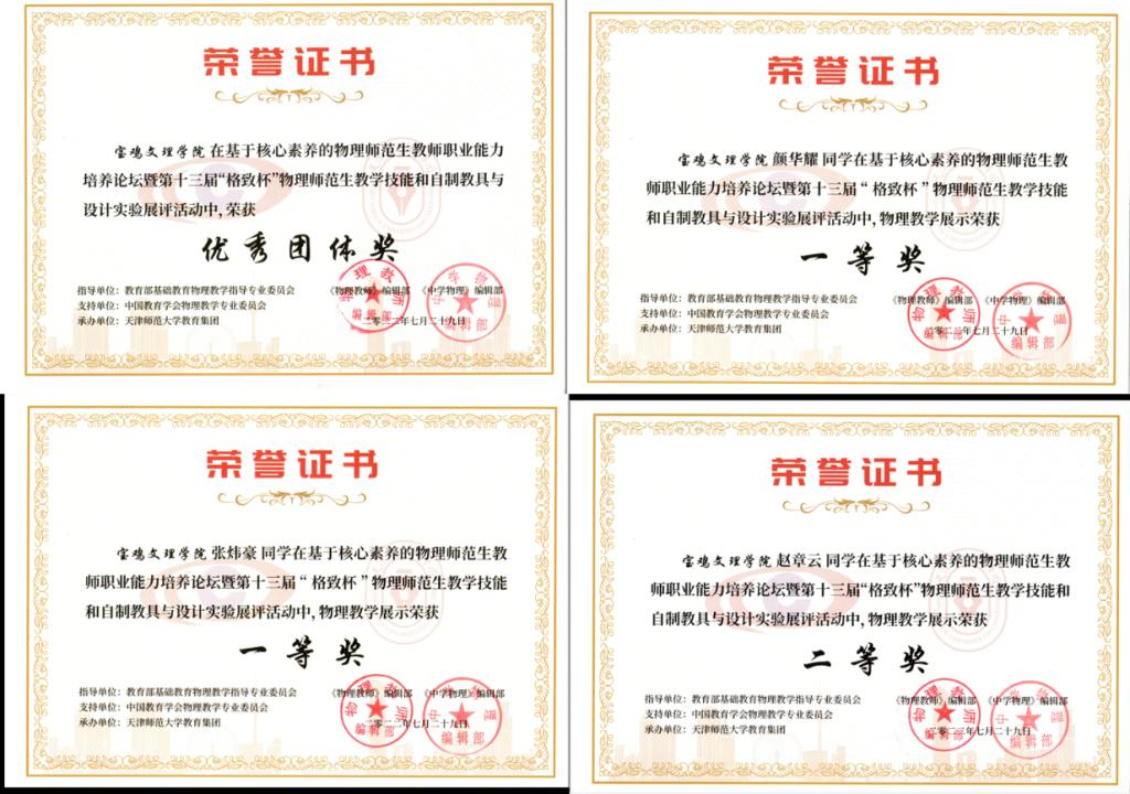 近日,由教育部基础教育物理教学指导专业委员会、《物理教师》编辑部与《中学物理》编辑部共同主办的第十三届“格致杯”全国物理师范生教学技能展评活动在天津师范大学落下帷幕。beat365官网物理与光电技术学院学生获佳绩,其中,颜华耀、张炜豪同学获一等奖,赵章云同学获二等奖,薛慧香、王杰、刘颖等6位同学获三等奖,beat365官网获优秀团体奖。