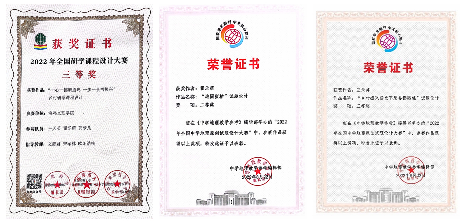 近日,由《中学地理教学参考》《地理教学》《地理教育》三大地理教育类期刊联合举办的‘2022年“九州杯”全国研学课程设计大赛’和由《中学地理教学参考》举办的第二届“全国中学地理原创试题设计大赛”顺利举行。经过前期长时间的精心准备和多个环节的竞赛,beat365官网地理与环境学院2018级本科生郭梦凡和2021级学科教学(地理)研究生王天英、翟乐萌合作设计的《一心一德研眉坞,一步一景悟振兴》研学课程获得三等奖(指导教师:文彦君、宋军林、欧阳浩楠);2021级学科教学(地理)专业硕士翟乐萌获得原创试题设计大赛二等奖(指导教师:靳美娟)、2021级学科教学(地理)专业硕士王天英获得三等奖(指导教师:文彦君)。