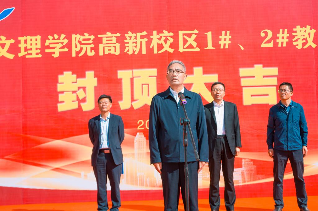 郭霄鹏代表学校对高新校区教师公寓楼主体顺利封顶表示热烈祝贺,并向参与项目建设的全体人员表示衷心感谢和亲切慰问。他指出,高新校区教师公寓楼建设项目是一项重大的民生工程,事关教职工切身利益,事关学校长远发展,特别是对学校稳定教师队伍、引进高层次人才、提高师资队伍水平等方面发挥着重要作用,将为学校快速发展提供强有力的保障。高新校区教师公寓楼工程项目的顺利封顶,标志着工程建设取得了阶段性胜利,为后续工程建设奠定了坚实基础。他强调,各参建方要继续保持艰苦奋斗的优良工作作风,再接再厉、履职尽责、协同配合,按照安全文明施工要求,扎实做好二次结构及装饰装修等后续工程建设,严抓工程质量,确保项目高质量如期交付使用,将高新校区教师公寓楼建成一个精品工程、满意工程、放心工程,为学校和广大教职工交上一份满意的答卷。