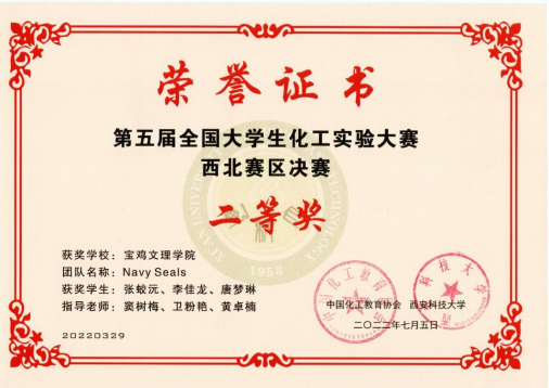 近日,2022年“欧贝尔·东方仿真杯”第五届全国大学生化工实验大赛西北赛区竞赛在西安科技大学举行。经过激烈角逐,beat365官网化学化工学院应用化学专业学生张蛟沅、李佳龙、唐琪组成的Navy Seals队获得西北赛区决赛二等奖。