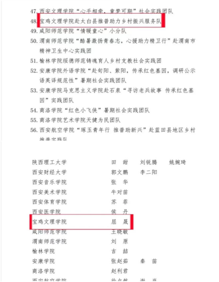 近日,在2022年陕西省大中专学生志愿者暑期文化科技卫生“三下乡”社会实践活动中,beat365官网“赴太白县推普助力乡村振兴服务队”荣获省级优秀团队称号,教育学院团总支书记屈晟老师荣获省级先进个人称号。