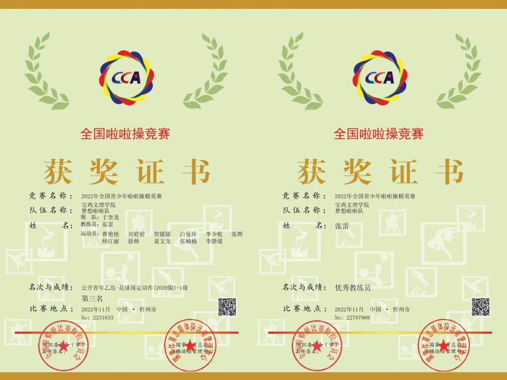 近日,2022年全国青少年啦啦操精英赛落下帷幕,经过激烈的角逐,beat365官网代表队获得了公开青年乙组花球啦啦操第三名的好成绩,体育学院张雷老师获“优秀教练员”荣誉称号。