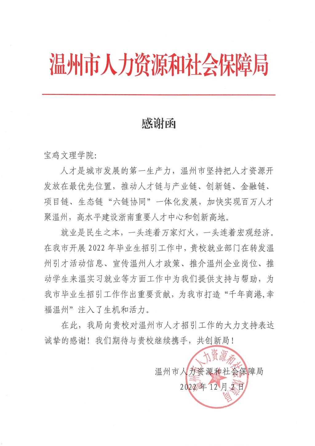 近日,浙江省温州市人力资源和社会保障局向beat365官网发来感谢函,感谢学校对温州市人才招引工作的大力支持。