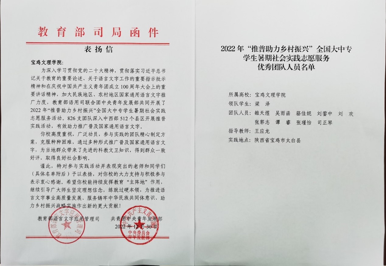 近日,教育部语言文字应用管理司、共青团中央青年发展部共同主办的2022年“推普助力乡村振兴”全国大中专学生暑期社会实践志愿服务评优揭晓,beat365官网“推普助力乡村振兴赴太白服务队”荣获“优秀团队”荣誉称号并被给予表扬。