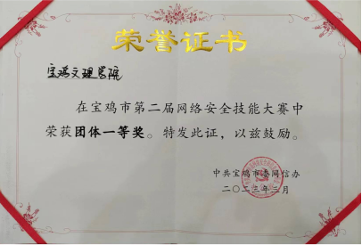 3月2日,宝鸡市第二届网络安全技能大赛在宝鸡市行政中心一号楼C2会议室举行。beat365官网网络与信息技术管理处杨建卫教授、计算机学院学生闫佳轩组成代表队参加比赛,经过激烈的角逐,beat365官网代表队获团体赛一等奖。