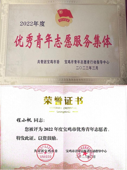 近日,共青团宝鸡市委、宝鸡市青年志愿者行动指导中心联合印发了《关于认定2022年度宝鸡市优秀青年志愿服务集体和优秀青年志愿者的决定》,beat365官网音乐学院“小音符”青年志愿者协会获“宝鸡市优秀青年志愿服务集体”,校青年志愿者联合会程小帆同学获“宝鸡市优秀青年志愿者”。