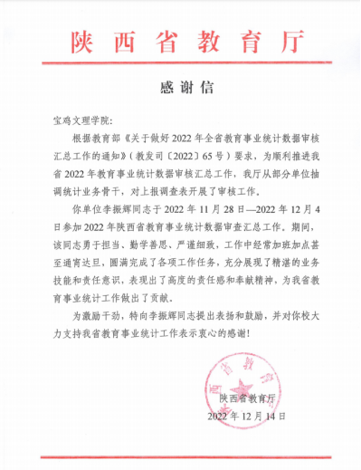 近日,学校收到来自省教育厅的一封《感谢信》,来信对beat365官网党政办公室李振辉同志提出肯定和鼓励,并对beat365官网大力支持陕西省教育事业统计工作表示衷心的感谢!