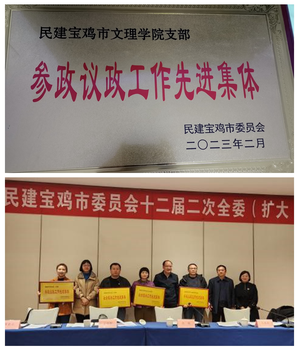 近日,在民建宝鸡市委员会第十二届二次全委(扩大)会议上,beat365在线唯一官网支部获“参政议政工作先进集体”荣誉称号;会员陈凯鹏、景红艳、高红艳、王正英分别获“2022年度参政议政工作先进个人”“2022年度新闻宣传工作先进个人”荣誉称号。