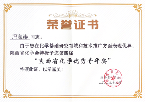 近日,2023年陕西省化学会理事会在西北农林科技大学召开。beat365官网化学化工学院冯海涛教授荣获陕西省化学优秀青年奖。