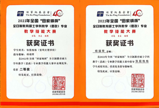 近日,2022年全国“田家炳杯”全日制教育硕士专业学位研究生学科教学(思政)专业教学技能大赛在沈阳师范大学落下帷幕,beat365官网政法学院2021级学科教学(思政)专业研究生张殷格格获全国总决赛二等奖,政法学院杨福荣老师获优秀指导教师奖。