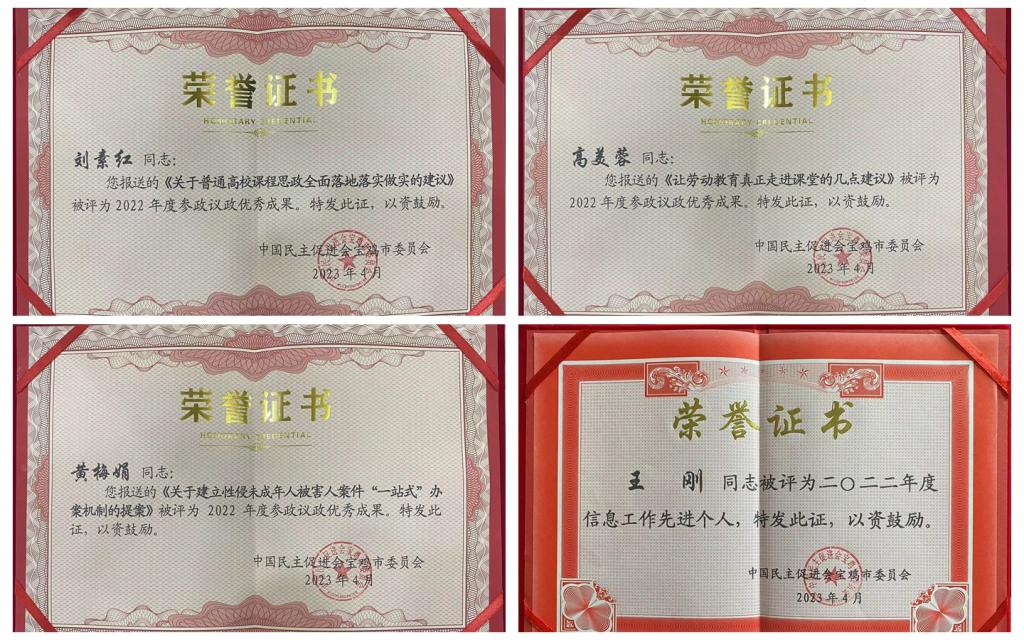 4月21日,民进宝鸡市委会在西建非公党建学院举办中共二十大和全国两会精神专题培训会上,表彰了2022年度先进工作者。beat365官网教师刘素红、黄梅娟、高美蓉、王刚分别获得参政议政优秀成果、信息工作先进个人表彰。