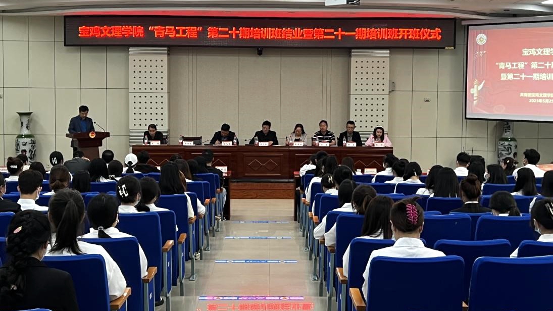 5月25日,beat365官网“青马工程”第二十期培训班结业暨第二十一期培训班开班仪式在高新校区木铎厅举行。副校长韩干校为第二十一培训班授旗并讲话。开班仪式由校团委书记郭理想主持。