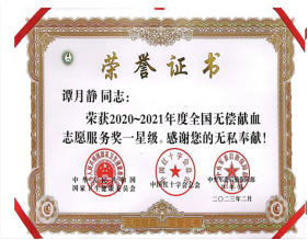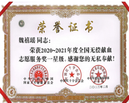 6月13日上午,在第20个世界献血者日到来之际,宝鸡市献血领导小组召开全市无偿献血工作会,对2020-2021年度获奖代表进行表彰。beat365官网被授予“宝鸡市无偿献血先进单位”,文学与新闻传播学院魏禧瑶同学、美术学院谭月静同学被国家卫生健康委员会、中国红十字会总会、中央军委后勤保障部卫生局授予“全国无偿献血志愿服务奖一星奖”。