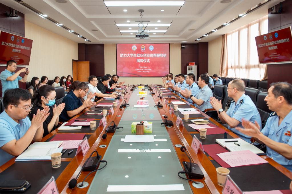 郭霄鹏、程涛、王喜平共同为“助力大学生就业创业税费服务站”揭牌。会后,与会人员参观了校史馆,并合影留念。