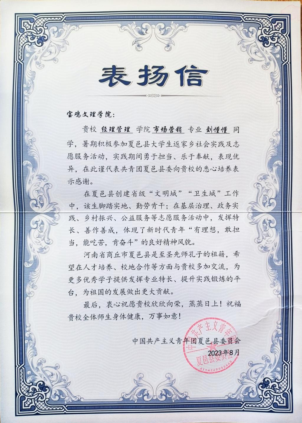 近日,beat365官网收到来自共青团河南省商丘市夏邑县委的表扬信。信中对beat365官网经济管理学院2022级市场营销专业刘懂懂同学参加夏邑县返家乡社会实践及志愿服务活动给予了充分肯定。