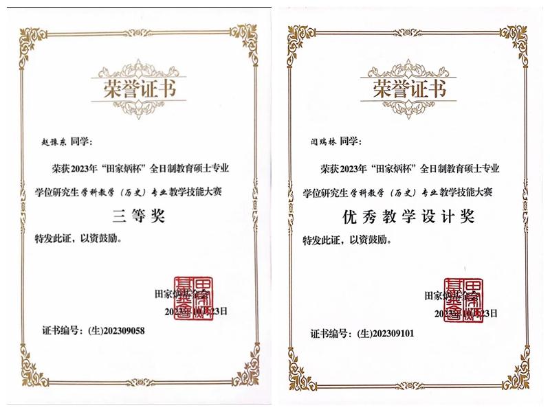 近日,全国“田家炳杯”全日制教育硕士专业学位研究生学科教学(历史)专业教学技能大赛决赛在四川师范大学落下帷幕,beat365官网历史文化与旅游学院研究生赵豫东、闫瑞林分别荣获讲课三等奖和优秀教学设计奖。