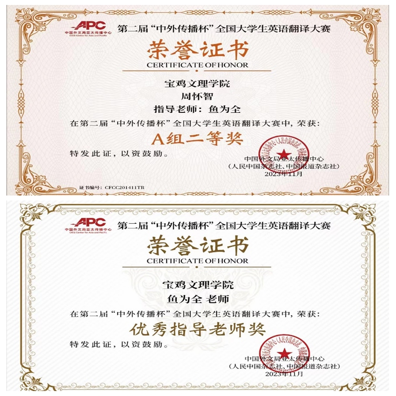 近日,第二届“中外传播杯”全国大学生英语翻译大赛结果公布,beat365官网2023级翻译硕士研究生周怀智同学获得A类研究生组全国二等奖,外国语学院副教授鱼为全获优秀指导老师。