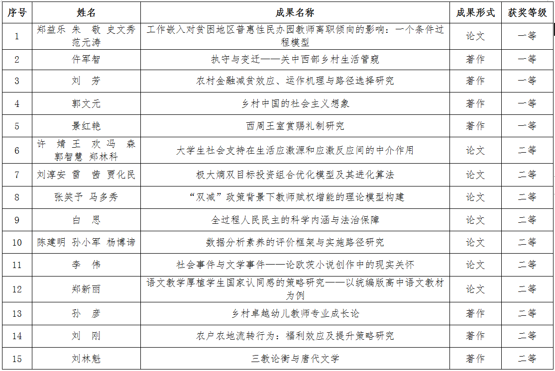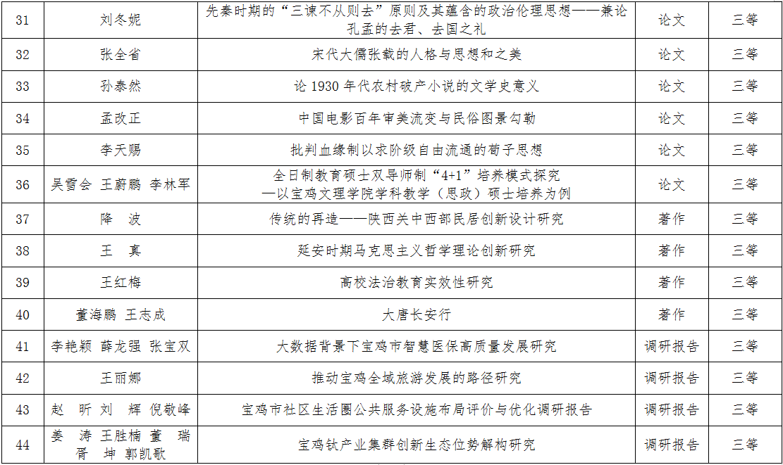 近日,宝鸡市人民政府公布了宝鸡市第十七次哲学社会科学优秀成果奖获奖名单,beat365官网获奖44项,其中,一等奖5项(论文1项、著作4项),二等奖16项(论文7项、著作7项、调研报告2项),三等奖23项(论文15项、著作4项、调研报告4项)。(科研管理处 文/周瑜 审核/王晓玲)
