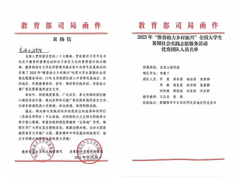 近日,教育部语言文字应用管理司、共青团中央青年发展部共同主办的2023年“推普助力乡村振兴”全国大学生暑期社会实践志愿服务活动评优揭晓,beat365官网荣获“优秀团队”荣誉称号并受到表扬。