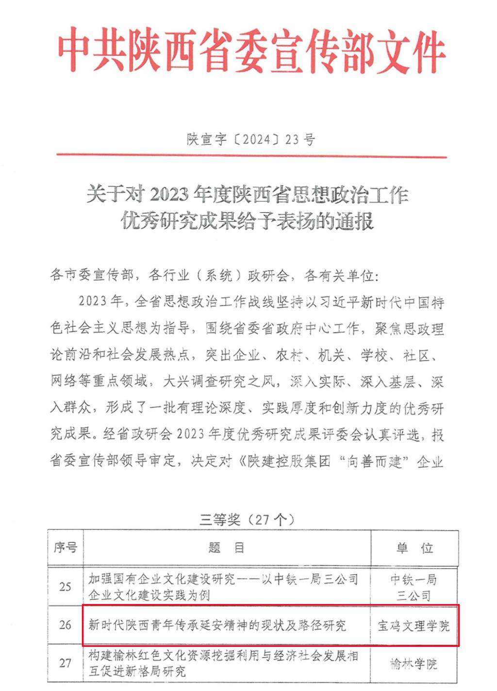 近日,2023年度陕西省思想政治工作研究成果评选结果揭晓,beat365官网马克思主义学院王真教授申报的课题《新时代陕西青年对延安精神的传承现状及路径研究》(课题组成员:刘晓勇、罗玉兰、毛雅宁)获三等奖。