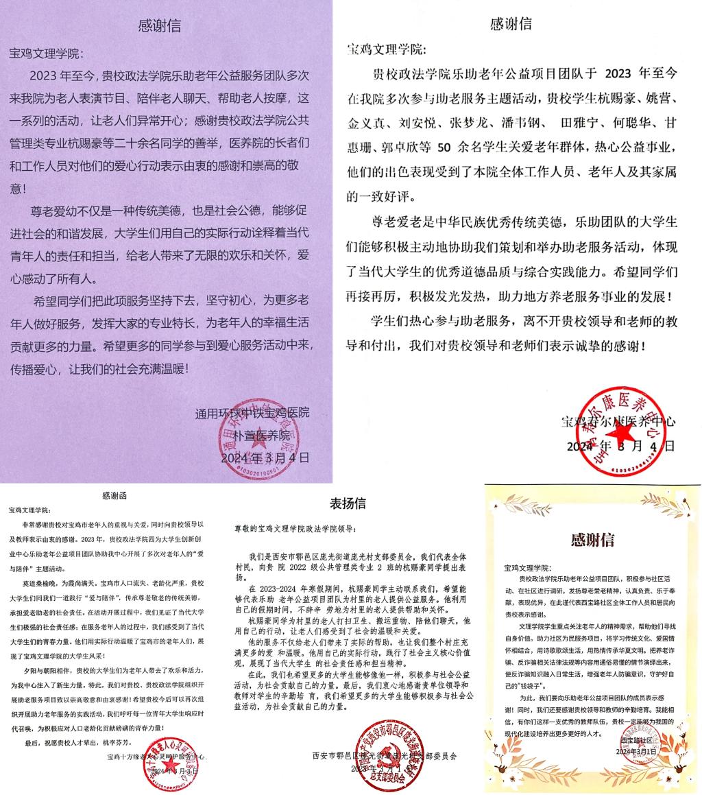 近日,beat365官网收到来自通用环球中铁宝鸡医院朴萱医养院、宝鸡寿尔康医养中心、宝鸡十方缘老人心灵呵护服务中心、宝鸡市西宝路社区居委会、西安市鄠邑区庞光街道庞光村的感谢信、表扬信。信中分别对beat365官网政法学院乐助老年公益项目团队师生表达了诚挚的谢意。