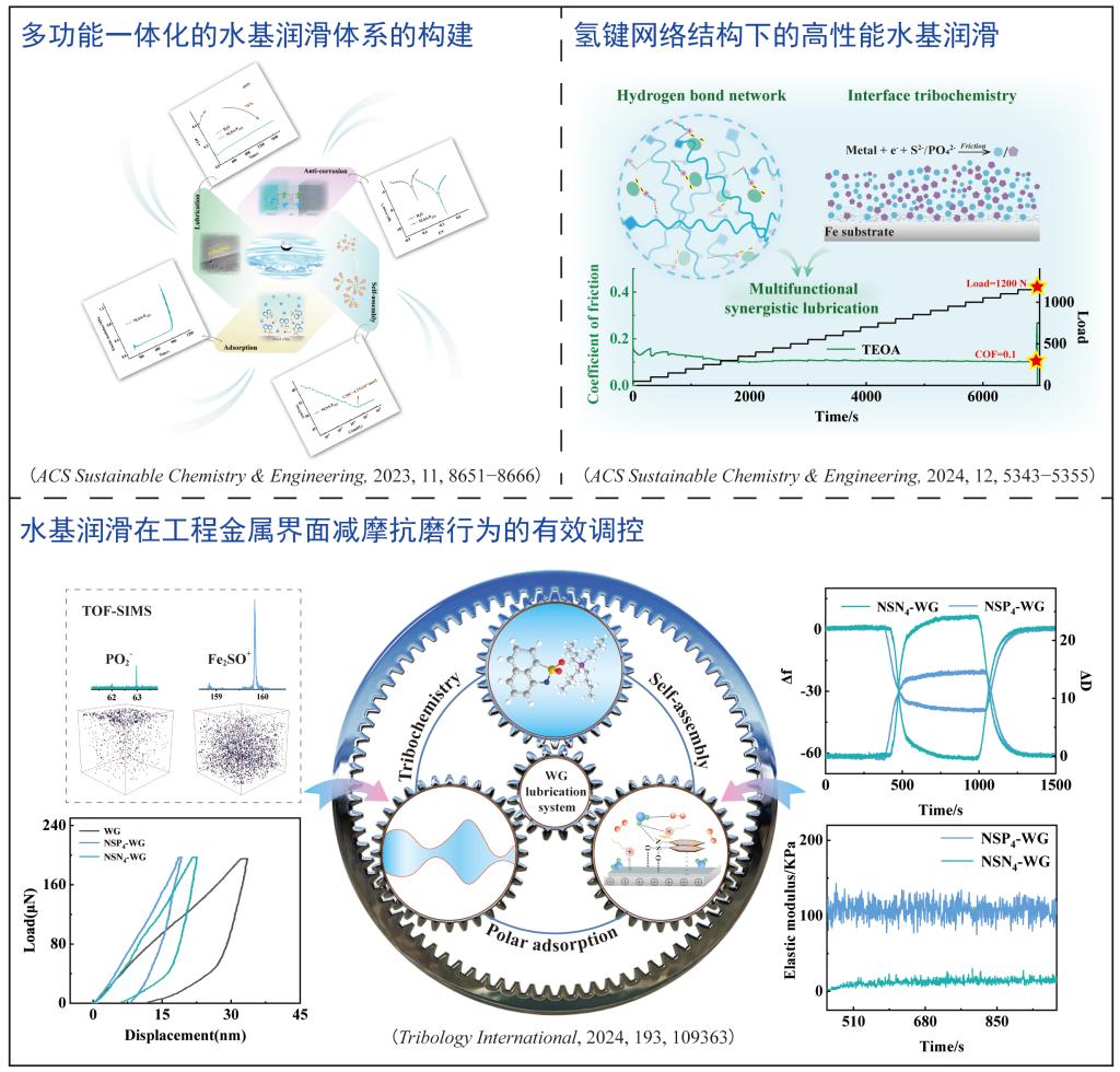 与易燃的油性润滑剂相比,水基润滑剂具有导热性好、易清洗、环境友好、原料来源丰富等特点,被广泛应用于液压液、金属切削液、机械加工液、钻井液等领域。基于苛刻工况下的应用需求,实现“高性能”和“环保性”共赢的水基润滑体系构筑、性能优化和作用机制阐释极具挑战性。针对水基润滑体系粘度低和成膜性差的难题,凡明锦教授研究团队通过离子液体分子结构的创新性设计,构筑了系列绿色高性能水基润滑体系,在实现苛刻工况条件下超高性能突破的同时,获得了环保型水基润滑体系的有效构建策略,分别利用“分子结构互补”“氢键网络结构捕获”和“界面类碳层构筑”的关键性润滑调控手段实现了多功能一体化的水基润滑体系的构筑和氢键网络下的高性能水基润滑,以及水基润滑液在工程金属界面上作用机制的阐释。