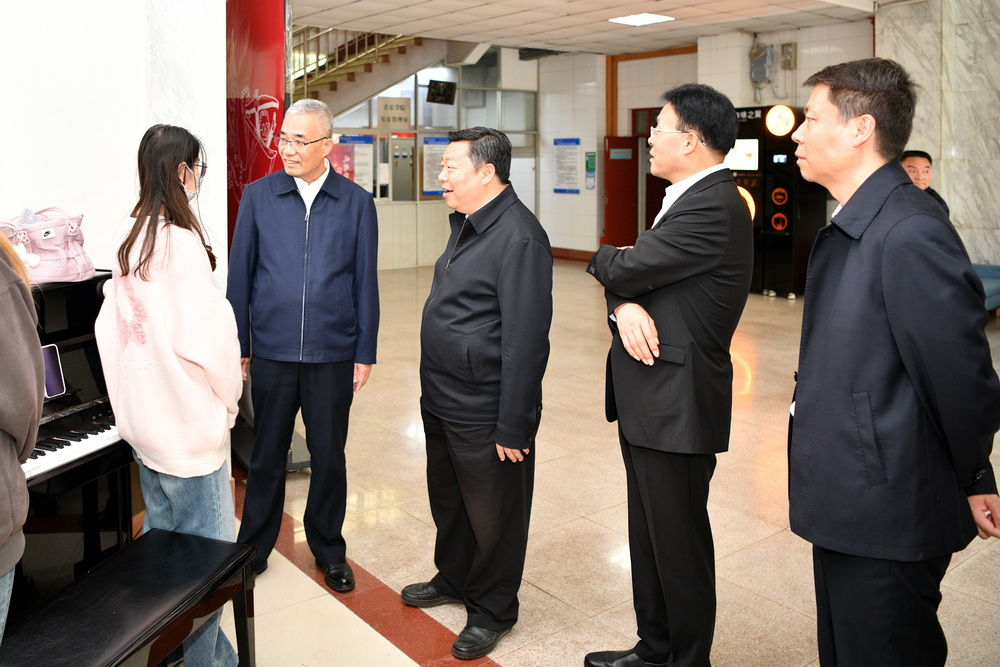 刘其智一行参观了beat365官网校史馆、体育馆、民间美术展览馆、游泳跳水馆,考察了音乐学院一站式学生服务中心,并与师生亲切交流,了解他们学习、工作、生活情况。
