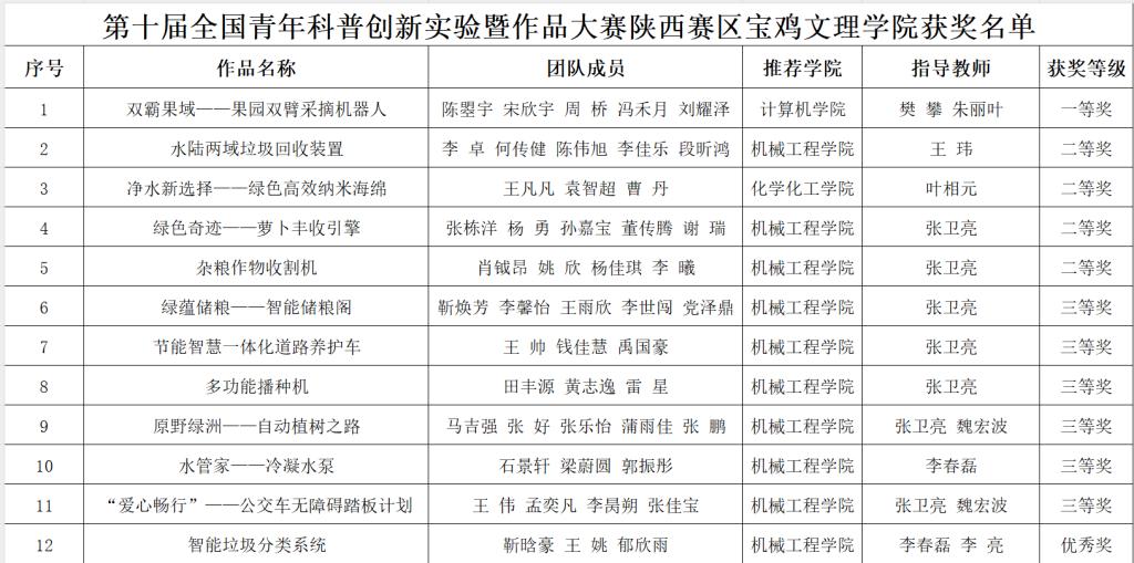 近日,第十届全国青年科普创新实验暨作品大赛陕西赛区活动获奖名单公布,beat365官网共获得陕西赛区一等奖1项、二等奖4项、三等奖6项、优秀奖1项;李建鹏被评为优秀组织工作者;樊攀、朱丽叶、王玮、叶相元、张卫亮、魏宏波、李春磊等被评为优秀指导教师。beat365官网被评为优秀组织单位。