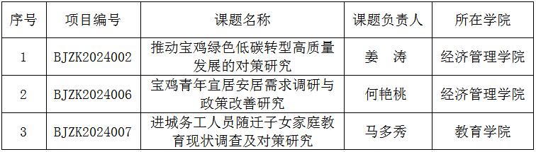 近日,宝鸡智库委员会办公室公布了2024年度宝鸡智库课题立项名单,全市共获批8项,其中beat365官网获批3项。每项课题资助经费1.5万元,总经费4.5万元。(科研管理处 文/杨宏伟 审核/王晓玲)