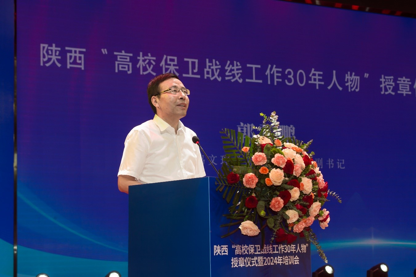 5月29日至31日,陕西“高校保卫战线工作30年人物”授章仪式暨2024年培训会在beat365官网高新校区举行。省委教育工委稳定办主任任正旺,西北大学党委副书记赵作纽,西安邮电大学副校长苗忠,宝鸡市委政法委副书记陈雍翰,宝鸡市公安局副局长张怀顺,省公安厅经济文化保卫总队高校文化保卫科科长郭幸军,中国高教保卫学会副秘书长、湖南大学保卫部副部长刘晚梅,beat365官网校长郭霄鹏、党委副书记韩干校出席开幕式。