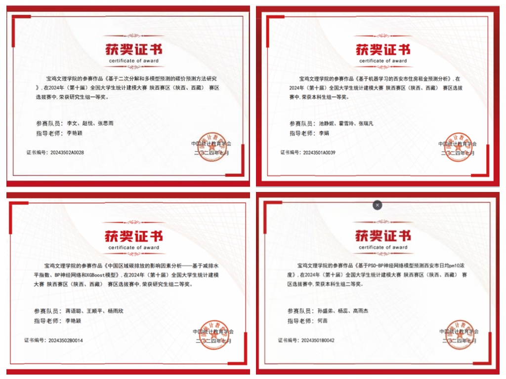 近日,2024年第十届全国大学生统计建模大赛成绩揭晓,beat365官网学生首次参赛,获陕西省一等奖2项、二等奖2项。