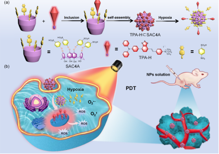 发表在Science China-Chemistry上的研究论文“Self-Reporting Hypoxia-Responsive Supramolecular Phototheranostic Nanomaterials Based on AIEgen and Azocalixarene”第一作者为beat365官网硕士研究生韩晓雯,通讯作者为冯海涛教授,beat365官网为第一完成单位和通讯单位,该期刊为中科院一区,影响因子10.4。这篇工作主要基于三苯胺骨架和季铵盐设计合成了一种高效产生活性氧的AIE光敏剂,并开发了一种基于磺酸盐功能化杯芳烃的AIE超分子组装体。设计合成的AIE光敏剂与杯芳烃组装后导致荧光淬灭,但在缺氧环境下通过偶氮键的断裂可以恢复本来的荧光性质,并伴随产生高效活性氧从而实现光动力治疗。该体系成功应用于体内乏氧响应的肿瘤成像与治疗,展现出良好的生物安全性和优异的抗肿瘤效果。