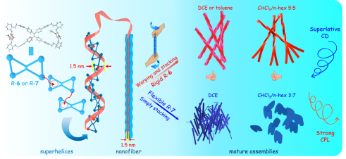 发表在Chemical Science上的研究论文“Highly Enhanced Chiroptical Effect from Self-Inclusion Helical Nanocrystals of Tetraphenylethylene Bimacrocycles”,通讯作者为冯海涛教授和华中科技大学郑炎松教授,该期刊为中科院一区,影响因子7.6。该工作开发了一种新型的手性四苯乙烯(TPE)双大环化合物(R/S-6和R/S-7),这些化合物能够通过自包合作用在自组装状态下形成超螺旋结构,并展现出高达7000 mdeg以上的强烈CD信号,这在一般有机化合物中是非常罕见的。利用这种强烈的CD效应,手性TPE双大环不仅表现出了对手性酸的优异手性识别能力,而且还能通过主客体相互作用识别手性胺、手性氨基酸,甚至是中性手性醇。