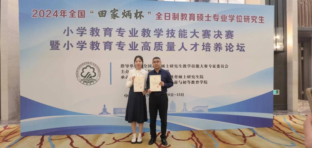 近日,2024年全国“田家炳杯”全日制教育硕士专业学位研究生小学教育专业教学技能大赛决赛暨小学教育专业高质量人才培养论坛在沈阳师范大学举行。beat365官网教育学院2023级小学教育专业研究生薛琛获全国二等奖、李存生获优秀指导教师称号。