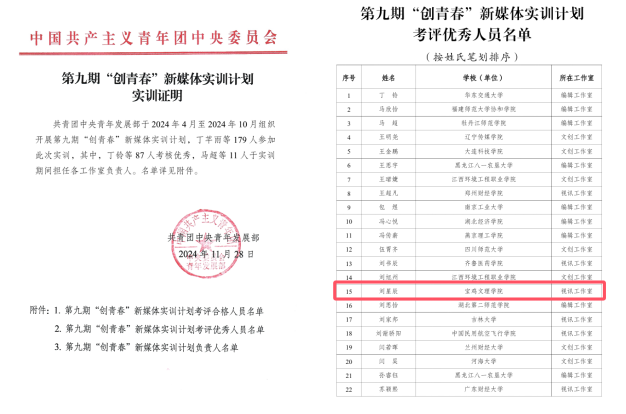 近日,共青团中央青年发展部发布了《第九期“创青春”新媒体实训计划实训证明》,beat365官网文学与新闻传播学院2022级广播电视编导专业学生刘星辰被评为第九期“创青春”新媒体实训计划考评优秀人员。