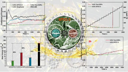 赵波同学完成的研究工作“Graphene/Trione Covalent-Organic-Frameworks Nanocomposite: Complementarity in Structure and Properties Improving Tribological Behaviors of PEG Base Oil”针对单一纳米材料作为润滑油添加剂在性能和结构上的先天缺陷,将石墨烯与共价有机框架纳米材料(Ton-COFs)复合促使其结构与性能互补,极大地提高了润滑性能。研究发现,以石墨烯层为模板,通过精确控制石墨烯的含量,可使Ton-COFs均匀且光滑地生长在石墨烯表面形成片层结构。这一创新实现了Ton-COFs的刚性与石墨烯的柔韧性之间的平衡,使得复合纳米添加剂能够自适应并覆盖在摩擦表面,形成保护润滑膜。对比PEG400基础油,在最佳添加量下,复合纳米材料的摩擦系数降低了33%,磨损体积减小了96%。该研究为促进共价有机框架纳米添加剂在实际润滑中的应用提供了一种有效策略。(研究生院、化学化工学院 文、图/王红阳、赵波、文平 审核/张光南、胡登卫)