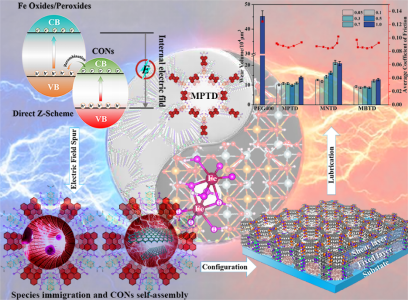 王红阳同学完成的研究工作“Covalent-Organic Framework Nanomaterials: Energy Band Engineering Inducing Ultra-thin Lubrication Film for Excellent Lubrication”针对金属摩擦副在大气环境中表面所覆盖氧化物或氢氧化物的半导体特性。基于能带工程合成了三种的酰亚胺基共价有机框架纳米材料作为润滑油添加剂。研究结果表明,共价有机框架纳米添加剂可吸附在金属氧化物或氢氧化物表面形成Z-型异质结构,摩擦诱导的电子跃迁在Z-型导质结间形成内建电场,一方面驱动金属表面磨屑在孔道内迁移并重新沉积产生钉扎效应;另一方面静电吸引自由共价有机框架纳米材料自组装形成滑动层,从而获得高强度、低剪切的双层构型润滑膜,并且发现共价有机框架纳米添加剂的减摩抗磨性能与其能带匹配和带隙宽度成正相关。该发现将启发人们利用金属材料固有的表面性质来开发润滑油添加剂或调控摩擦学行为,为发展先进润滑提供新的视角和方法。
