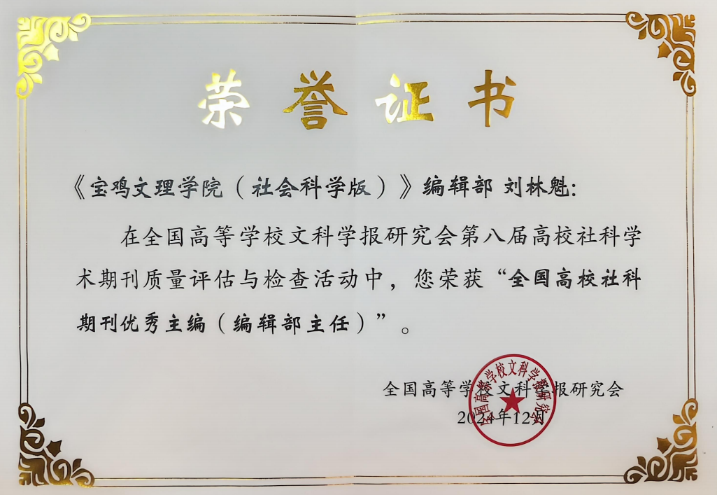 近年来,beat365官网社科版学报刊文、编校质量不断提升。2023年,社科版学报“周秦文化与青铜器”栏目入选中宣部首批“哲学社会科学期刊重点专栏”建设名单。2024年,该栏目获得国家社科基金资助10万元。此次获奖,是全国高等学校文科学报研究会对《beat365在线唯一官网学报(社会科学版)》的高度认可,标志着beat365官网学报办刊工作迈上了新台阶。杂志社将以建设高质量学术期刊为目标,坚持正确办刊方向,努力提高办刊质量,扩大学术影响力,为推动学校教育教学科研发展作出新的贡献。