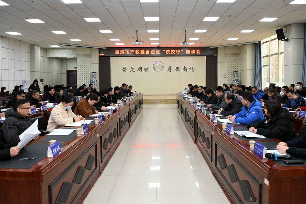 为进一步加强校企校地合作,深化产教融合,精准对接企业需求,探索科技创新与产业创新深度融合的发展路径,12月23日下午,宝鸡市产教融合企业“院校行”活动在高新校区举行。宝鸡市政府办、市教育局、市科技局、市工业和信息化局、市人力资源和社会保障局负责同志,钛及新材料、汽车及零部件、新能源、数控机床、轨道交通、机器人、传感器、生物医药等8条宝鸡重点产业链的38家企业负责人等40余人参加活动,活动包含参观考察和交流座谈两个环节。座谈会在图书馆甘棠厅举行,副校长凡明锦参加座谈会并致辞,会议由宝鸡市政府副秘书长苗崑主持。