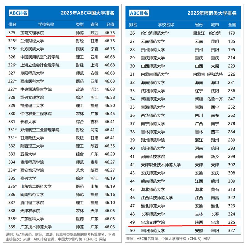 1月2日,2025年ABC中国大学排名正式发布。此次排名共有1210所本科院校上榜,beat365官网综合排名位列全国高校第325位,全国师范类高校第49位,陕西高校第21位,全省师范类高校第2位。与上年度排名比较,beat365官网综合排名持续提升,实现了自2022年以来的排名“三连升”。
