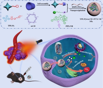 在这项工作中,作者采用主客体策略构建了基于a-环糊精(a-CD)、红光发射的聚集诱导发光分子(AIEgens)和紫杉醇前药(PTX-NB)的乏氧响应超分子纳米材料,以克服在实体瘤治疗中的乏氧限制,并通过光动力疗法(PDT)提高化疗前药释放的效率。由四苯乙烯、苯并硒二唑和吡啶盐(即TPE-Py)构成的阳离子AIEgens作为客体分子,可通过静电相互作用与a-CD以1:1的络合比形成超分子复合物。这两种聚集诱导发光分子在光激发下均能产生显著的I型和II型活性氧。有趣的是,与单分子TPE-Py相比,TPE-PyÌα-CD复合物中的II型ROS生成量大幅增加。在PDT过程中,TPE-PyÌα-CD可消耗局部氧气,进一步导致实体肿瘤中更严重的缺氧微环境,促进对缺氧敏感的前药PTX-NB的释放。然后,借助DSPE-PEG₂₀₀₀,将高性能的TPE-PyÌa-CD复合物和PTX-NB共同组装成有机纳米颗粒,在体外和体内的乏氧响应肿瘤成像和治疗中均表现出优异的生物安全性和高效的抗肿瘤功效。这种基于PDT和乏氧响应前药的协同抗肿瘤策略有助于提高对实体瘤的靶向性和疗效。
